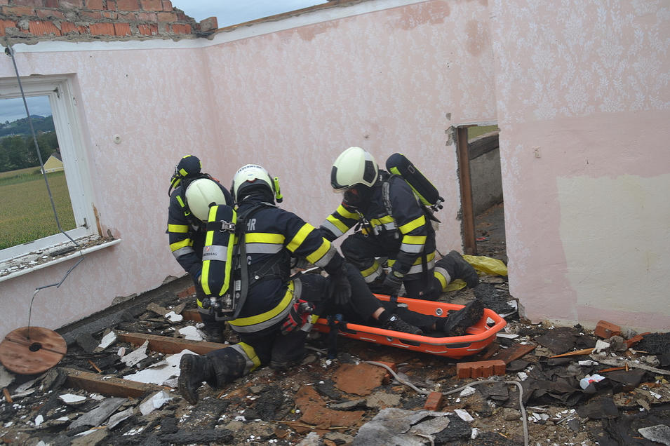 Übungsannahme war ein Brand mit zwei vermissten Personen und der Schutz des Nachbarobjektes.