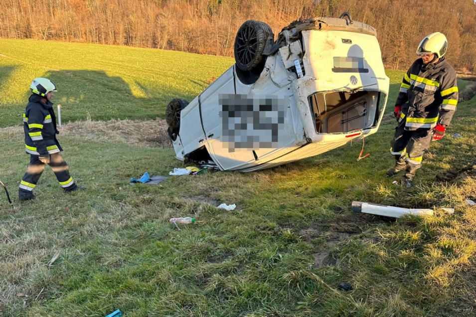Bei Eintreffen der Einsatzkräfte konnte ein PKW auf dem Dach liegend vorgefunden werden. Zum Glück befanden sich die beiden